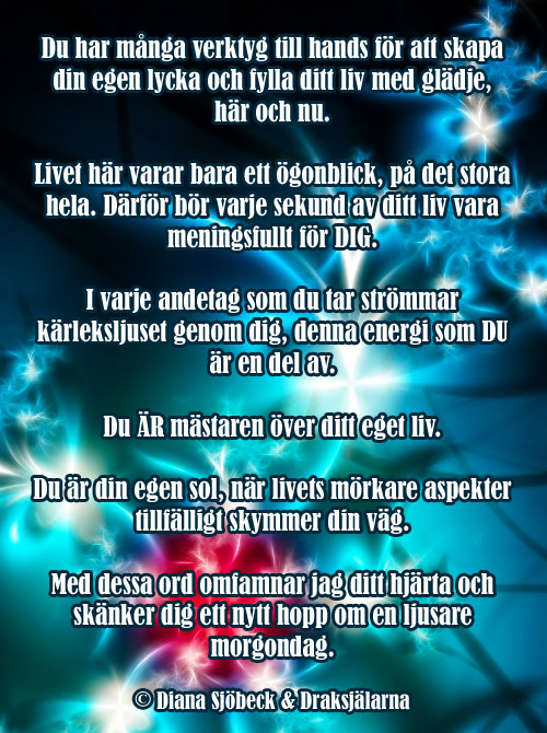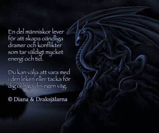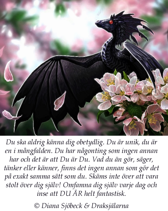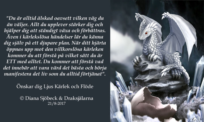 För att vandra på de stjärnbeströdda stigarna sidan om Drakarna och ta del av livets mysterier, kräver som sagt en hel del inre arbete, innan detta utbyte blir möjligt. För att påbörja denna resa, krävs förmågan och viljan till att dyka djupt ner i sitt undermedvetna och möta alla rädslor och smärtsamma minnen som sedan länge är gömda. Denna resa är inte för vem som helst och den måste man göra ensam. De högadliga Drakarna är också godhjärtade, tålmodiga men också ganska stränga. De ser igenom fasaderna, manipulativ energi och allt som inte är i kontakt med kärleksljuset. Liksom de sanna mästarna ogillar de starkt att bli dyrkade. De äger stor visdom och kunskap inom många olika områden och vill inget annat än att vi människor ska komma i bättre kontakt med vårt Högre Jag, se vår egen gudomlighet och låsa upp vår sanna potential. Människor får tycka vad de vill om Drakar, hälften av det de tror är ändå inte sant. För mig är det en ära att vandra sidan om dessa fantastiska väsen och det är jag enormt stolt över.