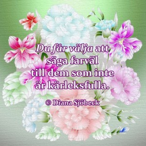 Det jag vill säga dig är att: trygghet, kärlek, omtanke, respekt osv. är livets utmärkande egenskaper som du på egen hand, först och främst, bör skapa själv. Var sen nöjd och stolt över detta arbete, för det kan ingen ta ifrån dig. Ge aldrig någon annan makt över ditt eget liv och välbefinnande. Släpp taget om dem och lägg mer energi på de underbara vännerna som hjälper dig, älskar dig, uppmuntrar dig, motiverar dig, inspirerar dig, stärker dig och gör dig lycklig.