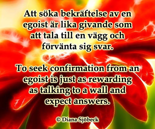 Så varför söka efter bekräftelse från egoistiska människor när de inte ens är medvetna om dem själva och hur de beter sig. Vill du ha några vettiga svar av den sortens människor är det lika givande som att prata till en vägg och förvänta dig svar. Bli vän med dig själv, lyssna inåt, ha en dialog med dig själv, högt om du så önskar, följ ditt hjärta. Ventilera med någon som inte är så uppslukad av sig själv eller ständigt relaterar till någon annan. Ge inte upp, var dig själv, var äkta och sann i dig själv. Var den som visar vägen, även om du går motströms, eftersom förr eller senare måste denna ohälsosamma trend vända och människor börjar tänka med hjärtat.