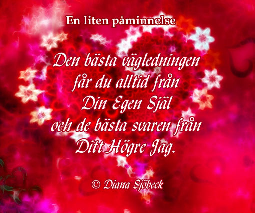 Andligt uppvaknande med Diana SjöbeckJag vill påminna dig om att du inte är ensam i din strävan till en mer balanserad och harmonisk tillvaro och värld. Tillsammans kan vi göra skillnad och underverk men inte så länge vi känner oss separerade ifrån varandra. Förståelse och empati är endast vackra ord som inte har någon betydelse om de inte praktiseras. Din förmåga över att älska är inte begränsad till några få eller enbart till dig själv. Din kärlek är större och kraftfullare än vad du själv tror och det vill jag att du ska komma ihåg. Inskränkningar av olika slag existerar endast i dina sinnen och så länge ditt sinne styr ditt hjärta kommer du att känna dig maktlös. Du är långt ifrån svag, du är storslagen, kärleksfull och oövervinnlig. Min önskan är att du omfamnar ditt inre, oavsett vad som finns inom dig, och sträva efter att läka dina sår med hjälp av den Oändliga Källan av Ljus och Kärlek.