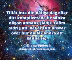 Ansvar är något vi alla har gentemot varandra och är inget som bara går åt ett håll. Detta är en, av de många stegen som vi människor tar, när det gäller vår personliga utveckling. Visst finns det begrepp på vad som är rätt och fel. Det är fel att ljuga och sprida osanningar. Det är fel att inte ta ansvar för sina kärlekslösa handlingar, tankar, ord och känslor, särskilt när dessa riktas mot någon som inte förtjänar det. Har man inte förstått denna enkla regel och tar illa vid sig när detta påpekas (har inget med dömande att göra) har man inte förstått läxan.