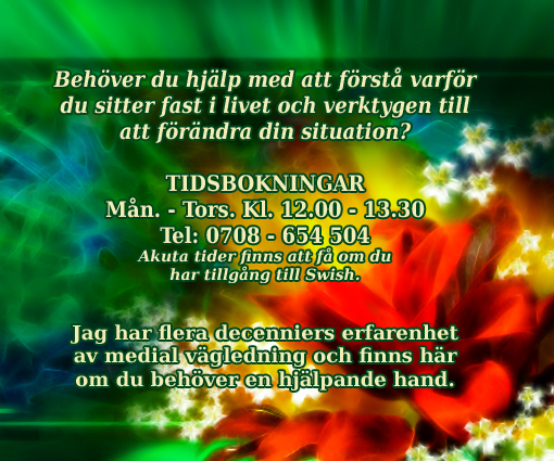 Många människor har ett negativt mönster och beteenden som de inte vill se. Hur manifesteras denna obalans fysiskt i omgivningen och i kroppen? Min guide brukar fråga en del människor ”Hur ska du någonsin förstå din egen resa i livet om du ständigt vänder kappan efter vinden?” Det finns väldigt mycket vi kan hjälpa dig med, när det gäller din personliga utveckling, svar på varför du sitter fast på olika plan i livet. Det finns ett bättre liv bortom den tyngden ifrån ditt förflutna som hindrar dig ifrån att leva ett liv i kärlek och glädje. Det är du som måste bestämma dig för att du inte längre vill slösa bort ditt liv genom att älta det förflutna. Det är du som måste sluta lyssna på råd som inte hjälper dig framåt. Det är du som måste ta ett beslut om att göra de förändringar som krävs för att verkligen leva livet. Vi finns här för att hjälpa dig när du är redo.